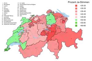 More than half, 56.3%, of all voters were against the initiative, with only the cantons of Basel-Stadt, Zurich, Geneva, Jura, Vaud and Neuchâtel in support; this meant the initiative would have narrowly passed in western Switzerland, but clearly failed in the German-speaking parts.[4] In Switzerland, the passing of a constitutional amendment by initiative requires a double majority; not only must a majority of people vote for the amendment but also a majority of cantons give their consent.