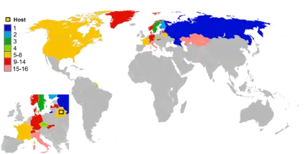 - ↑ If 22 World Championship titles won by the Soviet Union are included, this total comes to 27.