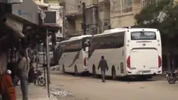 On 28 March 2017, an agreement was brokered by Qatar and Iran for the evacuation of those living in Fu'ah and Kafriya in exchange for the evacuation of residents and rebels in Zabadani and Madaya.[13] The agreement came under effect beginning on 12 April and buses and ambulances arrived in the four towns with the assistance of the Syrian Arab Red Crescent to begin the evacuations.[14] On 14 April, 60 buses transported 2,350 people, including 400 rebels, from Madaya and Zabadani to Idlib.[15] After being suspended for several days following a suicide bombing of buses carrying refugees, the first phase of the evacuations was completed on 19 April, with further transports planned for June.[16] A total of 30,000 people are to be relocated by the end of the operation.[16]