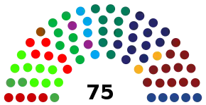 The Senate consists of 75 members elected every four years by the members of the States-Provincial of the country's twelve provinces, and, following a law change in 2017, electoral colleges representing the special municipalities of Bonaire, Sint Eustatius and Saba,[5][6] who are in turn elected directly by the citizens two months earlier in the 2019 provincial and electoral college elections. The seats are distributed in one nationwide constituency using party-list proportional representation.[7]