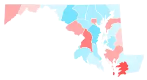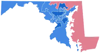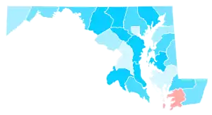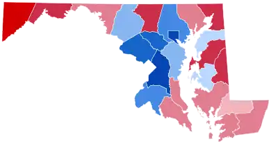 With the exception of racially polarized Somerset County, every county in the state swung to Biden from Hillary Clinton's performance in 2016; many swung Democratic by double digits.[29] The Republican presidential vote share has now declined for four elections in a row in the Old Line State, the longest such current run for the party in any state. It was also one of five states in the nation in which Biden's victory margin was larger than one million raw votes: the others being California, New York, Massachusetts and Illinois.