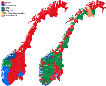 The election was won by a coalition consisting of the social-democratic Labour Party and the agrarian Centre Party that entered into negotiations to form a government.[3][4] The election also resulted in a majority for the parties that seek to dissolve the unpopular and controversial Viken county.[5] Jonas Gahr Støre's Labour Party retained its position as Norway's largest party and expanded their lead in seats over the Conservatives, despite a slight drop in its share of votes and the loss of one seat.[2] Incumbent Conservative Party prime minister Erna Solberg conceded defeat.[6] Her party ended up with the second-largest number of representatives. Støre aimed to form a majority government with the Centre Party and the Socialist Left Party,[7][8] but the latter stated they would remain in opposition citing disagreements over climate and welfare policies,[9] while remaining open for future negotiations and to support the government on common grounds.[10] On 14 October, Støre became prime minister of a minority government, the Støre Cabinet.[11][12]
