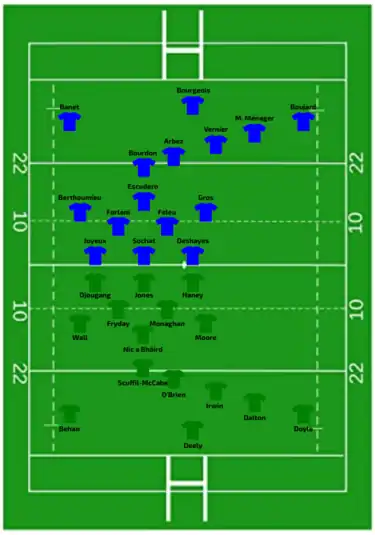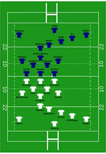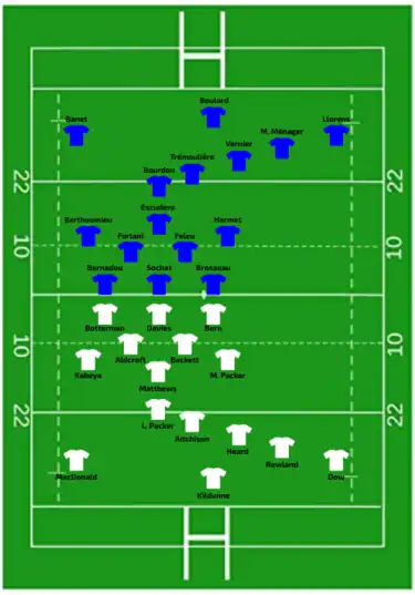 Try: Dow 17' m M. Packer 26' c Matthews 32' c Penalty try 36' Aldcroft 40' +2 c Davies 60' m Con: Rowland (3/5) 26', 33', 40' +3 | Report | Try: Boulard 49' c Vernier 56' c Escudero 66' c Gros 76' m Banet 80' c Con: Trémoulière (3/4) 50', 57', 67' Arbez (1/1) 80' +1 |