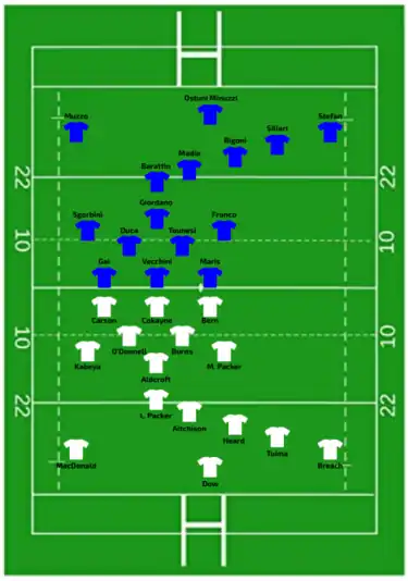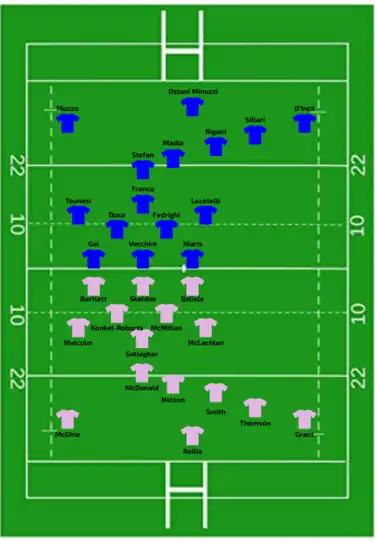 Try: McMillan 12' m Skeldon (2) 36' m, 68' m Bartlett (2) 47' c, 52' c Con: Nelson (2/5) 48', 54' | Report | Try: Franco 30' c Tounesi 58' c Vecchini 61' c Con: Sillari (3/3) 31', 59', 62' |
