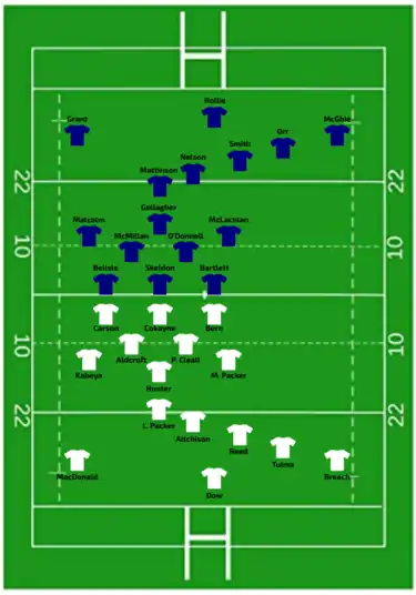 Try: Smith 40' +1 m Skeldon 48' m Bartlett 57' m McGhie 66' c Malcolm 75' c Rollie 80' +2 m Con: Nelson (3/6) 59', 67', 76' | Report | Try: Fryday 54' c Con: O'Brien (1/1) 55' Pen: O'Brien (1/1) 6' |