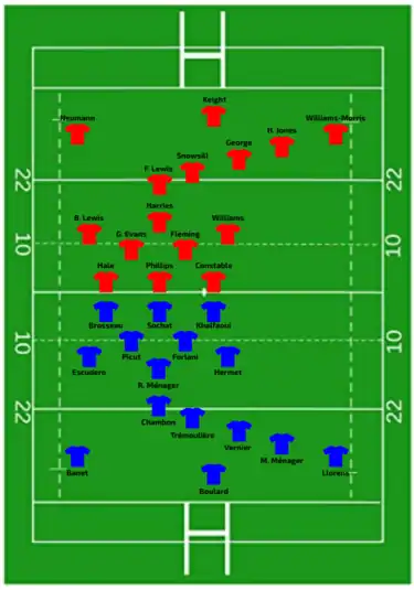 Try: R. Ménager 1' c Hermet 10' c Llorens (2) 25' c, 40' +1 m Escudero 44' m Bernadou 78' m Con: Trémoulière (3/6) 3', 11', 26' Pen: Trémoulière (1/1) 6' | Report | Try: G. Evans 52' c Pyrs 57' c Con: Snowsill (2/2) 53', 58' |