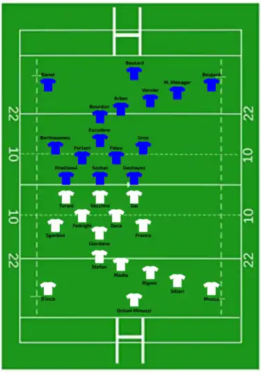 Try: Franco 22' c D'Incà 48' m Con: Sillari (1/2) 24' | Report | Try: Vernier 25' m Arbez 34' c Boujard 75' c Con: Bourdon (1/2) 35' Trémoulière (1/1) 76' Pen: Bourdon (1/2) 8' |