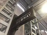 A second fare control area at the southern end of the southbound platform leads to a privately operated passageway in the basement of the New York Life Building, between 26th and 27th Streets.[26] It is only open from 7 a.m. to 7 p.m. on weekdays.[59] The New York Life Building entrance has an Art Deco inspired interborough subway sign hanging from the facade of that building.[2]: 8 [59][60]