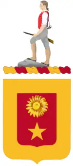 The 311th's coat of arms was approved on 15 July 1925 and its distinctive unit insignia was approved on 15 September of that year. Both were rescinded on 2 February 1959. The distinctive unit insignia included a 1 1/8 in (2.86 cm) gold colored metal and enamel device, which consisted of a red shield with gold borders. A gold sunflower was depicted above a gold star in the center of the shield. The yellow border of the shield symbolized the cavalry, and the red represented the 311th's artillery service. The sunflower represented Kansas, where the regiment was organized, and the star symbolized Texas, where it was based in the interwar period. The regimental motto, "Siempre Adelante" (Always Forward), was attached to the bottom of the distinctive unit insignia. The regimental coat of arms was of a similar design to the distinctive unit insignia but included the Organized Reserve's Minuteman crest above the shield and omitted the motto.[7]