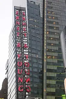 5 Times Square contains several electronic billboards on its facade, which obscure much of the second through fourth floors.[5][18] These billboards are included as part of the 42nd Street Development Project and were intended to evoke Times Square's historical signage.[18] Specifically, the building was required to contain at least 18,000 square feet (1,700 m2) of advertising signage.[20] At the northeast corner, the signs rise to the seventh story.[5] Hocking said his team used computer models to compare different types of signage.[21] However, the developers' signs had to be separate from those required by the 42nd Street Development Project.[21][22] As a result, a 22-story-tall vertical sign with the Ernst & Young name was mounted on the northeast corner of the building.[22]