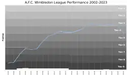 When AFC Wimbledon was formed, it affiliated to both the London and Surrey Football Associations, and entered the Premier Division of the Combined Counties League, the ninth tier of English football. The club has since been promoted six times in 13 seasons, going from the ninth tier (Combined Counties Premier) to the third (League One).
