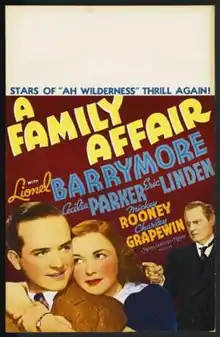 A Family Affair is a 1937 American comedy film directed by George B. Seitz. It was the first of 16 movies now known as the Andy Hardy series, though Andy Hardy, played by Mickey Rooney, did not become the main character in the series until a few more installments had been made. The movie features Lionel Barrymore as Judge Hardy and Spring Byington as his wife, who are Andy's parents. Barrymore and Byington were replaced in their roles by Lewis Stone and Fay Holden in the subsequent films.[2]