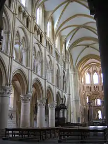 The nave, surrounded by two collaterals, gives itself up to the visitor's gaze as soon as he enters, with its three-story elevation, characteristic of the Primitive Gothic style.[18] The lower level features large pointed-arch arches supported by round pillars with circular carvings. The second floor consists of tribunes, inherited from the Romanesque style, which opens with double arches under a relieving arch with tiers-point. The second floor is a triforium, a passage that goes around the building, characteristic of Gothic architecture, topped again by a third floor of large windows. On the exterior, the flying buttresses, a recent technique at the time of construction, contribute to the solidity of the building.[12][19] Five radiating chapels surround the choir and open onto a five-sided ambulatory, giving this part of the church a specific size.[10]
