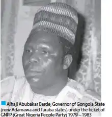 Barde was of Mumuye origin.[2] He was elected governor on the platform of the Great Nigeria Peoples Party (GNPP), holding office from 1979 to September 1983.[3] He inherited a backward and ethnically divided state, but did little to improve the situation. Many projects started by the previous regime were abandoned.[4] He did initiate a project to establish the Gongola Television Corporation (now the Adamawa Television Corporation) in 1982, but this was abandoned when the military took power in December 1983.[5]