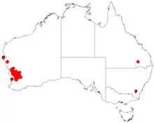 It is native to an area in the Mid West and Wheatbelt regions of Western Australia where it is commonly situated on low hills, around salt flats and depressions growing in loamy, clay or sandy clay soils often containing lateritic gravel.[1]