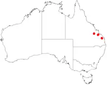 It is endemic to south eastern Queensland around Biggenden and is also present on the Blackland tableland where it is found on steep rocky slopes[1] and hilly terrain growing in stony and sandy soils. It is usually a part of woodlands, shrublands or heathland communities mostly in rocky areas or pavements. Associated species of trees found with A. pubicosta include Eucalyptus crebra, Eucalyptus acmenoides and Corymbia citriodora.[2]