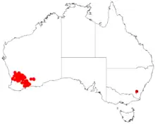 It is native to a large area in the southern Wheatbelt and the Great Southern regions of Western Australia where it is found among granite outcrops and hills.[1] The species is found Ballidu in the north to Ravensthorpe in the south east, it grows in granitic loam and sandy soils and is often a part of shrubland and mallee communities.[2]