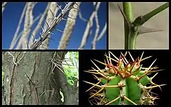 These are hard, woody, pointed structures meant for protection. They are provided with vascular tissue,[12] which may develop from the axillary bud or terminal buds.[13] They control transpiration by reducing the vegetative growth. In Bougainvillea, Punica granatum , and Duranta the axillary bud develop into thorns.[14][15][16][17] In Duranta, the thorns are provided with leaves and flowers. In Punica granatum, the thorns bear leaves and branches.[18] In Carissa carandas the terminal bud produces a pair of thorns. They help in protection.[19]