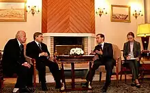After some prominent involvement in international diplomatic meetings earlier in 2008, Ouyahia was again named Prime Minister by Bouteflika on 23 June 2008.[2] On this occasion, he pledged "to continue to apply the policy programme of the President of the Republic."[21] The foreign and domestic press commented on the sometime stormy relations between Ouyahia and Bouteflika, which did not have the same way of his Prime Ministership.[22] Ouyahia's term ended on 3 September 2012, and he was replaced by Abdulmalek Sellal.[23]