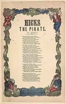 Henry Sherman Backus, an itinerant composer of murder ballads that romanticized crimes, dedicated a ballad titled Hicks the Pirate sung to the traditional Irish tune "The Rose Tree".[7] Irish singer-songwriter Vincent Cross recorded a modern take on the 1860 ballad for his album The Life & Times of James "The Rooster" Corcoran (2020) titled "Albert W. Hicks."[8][9]