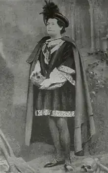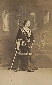 Marriott played Hamlet "thousands of times." On the first occasion, her "leading man disappointed her", she stepped in successfully: an encouraging start.[36] She was not the only woman to play Hamlet. Other Women in Black who played the part in the 19th century were Winetta Montague, Clare Howard, Louise Pomeroy, Charlotte Compton, Millicent Bandmann-Palmer, Julia Seaman and Oliph Webb, to name a few.[37][38] She is first recorded as playing Hamlet in an 1859 tour of Glasgow, Bath, Birmingham, Dublin and Liverpool, three years after marrying Robert Edgar, and one year after giving birth to Grace Marriott, of whom Edgar was not the father. Following this, she played the same Prince of Denmark at the Theatre Royal, Marylebone, in 1861.[1][27]