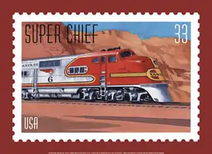 One of five All Aboard! 20th Century American Trains commemorative stamps issued by the USPS. Here, Santa Fe locomotive #6 (an EMD E1 unit) is seen painted in the Super Chief's distinctive Warbonnet livery.