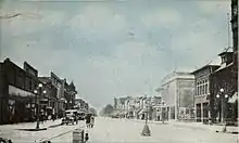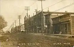 Alma grew rapidly in the latter part of the 19th century in large part due to the local lumber industry, but also due to the agricultural prosperity of the region.[3] The first commercial building in Alma was constructed in the late 1850s by General Ely; by 1884 the Alma commercial district encompassed the heart of what is now the Alma Downtown Historic District: Superior Street from just east of Woodworth to a point west of State Street, and another half-block both north and south along State. All but three of these buildings were wooden; the very first brick commercial building in Alma was built in 1875, the second was the grand 1880 Wright Opera House Block, and the third was the nearby 1883 Wright Hotel (now demolished).[4]