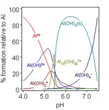 In aqueous solution, Al3+ exists as the hexaaqua cation [Al(H2O)6]3+, which has an approximate Ka of 10−5.[10] Such solutions are acidic as this cation can act as a proton donor and progressively hydrolyze until a precipitate of aluminium hydroxide, Al(OH)3, forms. This is useful for clarification of water, as the precipitate nucleates on suspended particles in the water, hence removing them. Increasing the pH even further leads to the hydroxide dissolving again as aluminate, [Al(H2O)2(OH)4]−, is formed.