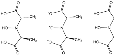 - 2 HON(CH(CH3)CO2H)2 + VO2+ → [V{NO[CH(CH3)CO2]2}2]2− + H2O + 4 H+