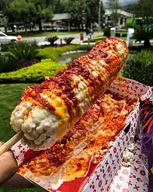 Elote refers to fresh corn (maize) which is served on the cob or cut kernels. If on the cob is it either grilled or boiled then coated with mayonnaise and dusted with any of the following: chili pepper, salt, cotija cheese, lime juice and hot sauce. The cut kernels are usually served in a dish called esquites, where similar seasoning is mixed in and it is eaten with a spoon.[3] Fresh fruits and vegetables can also be had as street food. Fruit cups are popular and vary depending on the season. They usually contain one or more of the following, watermelon, papaya, mango, orange, jicama and cucumber. These are cut into slender spears or cubes with lime juice, salt and chili pepper powder added.[8] Jicama is a root vegetable that is popularly eaten raw. It can be eaten in strips or chunks as part of a salad or fruit cup. A jicaleta is a large slice of vegetable placed on a stick and resembles a kind of large lollipop. It can either be eaten like this or then covered with a choice of sweet or savory flavored powders, hot sauce, lime juice and more.[3]