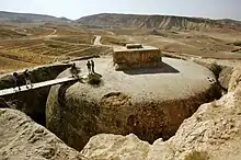 With the establishment of the Kushan empire both political and dynastic centers were established, with one such dynastic center identified in Afghanistan at Surkh Kotal, established during the height of Buddhism in Afghanistan.[1][3][4] Excavations of the site revealed a monumental set of stairs leading down the hillside from a Kushan temple, with these built in the first half of the 2nd century AD.[1][3][5] Zoroastrian associations are possibly evident in fire worship symbols, and exist alongside Buddhist architectural features. Hellenistic pilasters and column bases alongside a limestone with Greek letter inscriptions of an unknown language are evidence of Western influence,[3] while Iranian influences may also exist within the concept of a monumental dynastic centre.[1]