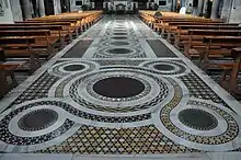 Examples of buildings from this period include the Torre delle Milizie, the Torre dei Conti, and the churches of Santi Quattro Coronati, Santa Prassede, Santa Maria in Cosmedin, and Santa Maria in Aracoeli. Elaborate tabernacles were popular especially in the 13th century, and basilicas were often full of rich mosaics.[1] In the 12th and 13th centuries, the Cosmati family was famous for their mosaics and elegant decoration. They created beautiful marble floors with mosaics, often with inlays of green and red porphyry. Their designs in Rome became so popular that they were known as Cosmatesque.[1]