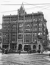 Elmer H. Fisher, an exponent of the Richardsonian Romanesque style, came to prominence immediately after the 1889 fire; he designed many of the new "fireproof" buildings in what is now the Pioneer Square neighborhood.[22] His best-known surviving building is the Pioneer Building (built 1889–1891) directly on Pioneer Square at First and Yesler; his equally grand Burke Building, built at the same time, was demolished to make way for the Henry M. Jackson Federal Building; a few of its decorative elements survive on the plaza of that Federal Building. Two other surviving Fisher buildings are also right at First and Yesler: the Yesler Building on the southwest corner and the Mutual of New York Building on the northwest corner, both initially built 1890–1891 and later enlarged. His Austin A. Bell Building (1889–1890, now Bell Apartments) remains an equally prominent feature of Belltown.[23]