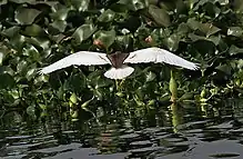 The Indian pond heron's feeding habitat is marshy wetlands. They usually feed at the edge of ponds but make extensive use of floating vegetation such as water hyacinth to access deeper water. They may also on occasion swim on water or fish from the air and land in deeper waters.[13][14][15][16] They have also been observed to fly and capture fishes leaping out of water.[17] [18] Sometimes, they fly low over water to drive frogs and fishes towards the shore before settling along the shoreline.[19] They have been noted to pick up crumbs of bread and drop them on the water surface to bait fishes.[20]