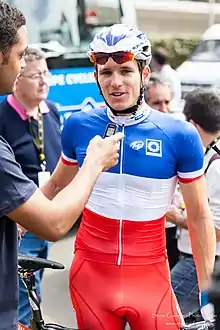 Arnaud Démare (born 26 August 1991) is a professional road racing cyclist who currently rides for UCI WorldTeam Arkéa–B&B Hotels.[3] In 2011 he won the UCI World Under-23 Road Race Championships,[4] and in 2016 he won the Milan–San Remo. He is one of five riders to have won the French National Road Race Championships three times, having won the race in 2014, 2017 and 2020.