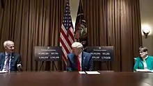 In August 2021, Hutchinson signed bills into law that prohibited businesses and government facilities from requiring proof of COVID-19 vaccination for staff and customers to enter facilities.[37] While Arkansas was experiencing a wave of COVID-19 cases, he also signed a bill into law that prohibited state and local officials from enacting mask mandates.[38] He later said he regretted doing so.[38] In December 2021, Hutchinson praised President Joe Biden's COVID policies and thanked Biden for his efforts to "get the vaccinations out" and "depoliticizing" the federal COVID response.[39][40] In January 2022, Hutchinson encouraged large businesses to not comply with the Biden administration's vaccine requirements.[41]