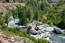 From the start of the D147 by Moltifao, the village of Asco is about 12 kilometres (7.5 mi) upstream.[4] The Asco gorge is a defile almost 4 kilometres (2.5 mi) long cut through red granite below Asco village.[5] It runs through a rugged landscape of steep cliffs and granite rocks. In it the river has carved out large natural pools.[4] There is little vegetation apart from some juniper and a few pines growing on the steep rick faces. The gorge draws many tourists in the summer months, attracted by its rugged topography and wild animals.[5]