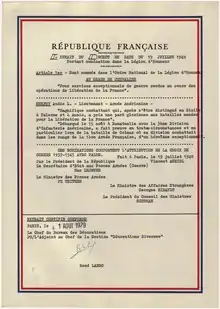 French Legion of HonorGrade of Chevalier (Knight) Decoration presented by General de Lattre de Tassigny in Paris on 19 July 1948. [6]