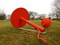The sculpture consists of two disks painted red-orange and attached by rods at their centers.