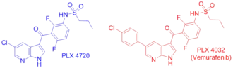 PLX4032 (Vemurafenib) is a V600 mutant B-Raf inhibitor approved by the FDA for the treatment of late-stage melanoma.[13] Unlike BAY43-9006, which inhibits the inactive form of the kinase domain, Vemurafenib inhibits the active "DFG-in" form of the kinase,[18][19] firmly anchoring itself in the ATP-binding site. By inhibiting only the active form of the kinase, Vemurafenib selectively inhibits the proliferation of cells with unregulated B-Raf, normally those that cause cancer.