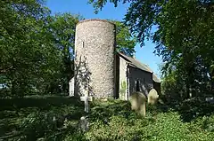 Barmer All Saints is a Grade II* listed building.[3] It is a small building and is one of 124 existing round-tower churches in Norfolk. The church sits off the road, about 250 yards across a field in a copse of trees. In 1602 it was already a ruin, but in 1885 the Kerslake family decided to turn it into a mausoleum and employed the architect Frederick Preedy to restore the church. What exists today is largely Victorian, but there are remains of its earlier history. The round tower is Norman, but the origins may have been Anglo-Saxon as indicated by the flint quoins at the west end of the nave. The chancel arch is 12th Century and the nave 13th Century. The church was declared redundant in 1970, and it was taken over by the Norfolk Churches Trust in 1978.