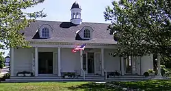 Library Hall is located roughly in the center of Bailey Island, on the east side of Harpswell Island Road (Maine State Route 24). It is a 1+1⁄2-story wood-frame structure, with a side-gable roof, clapboard siding, and a fieldstone foundation. A shed-roofed porch extends across the west side, supported by square posts with small capitals. The main facade has three pairs of French doors, evenly spaced, providing access to the hall, and there are three round-topped dormers in the main roof, which is capped by a small cupola with belfry. The east side of the building has a shed-roof ell extending across much of its width. Palladian windows are set on the building's north and south sides. The interior of the main block is a large hall, with the kitchen located in the rear ell. One end of the hall has a stage set under a proscenium arch.[2]