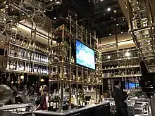 Spirits sit on a brass shelf that is suspended from the ceiling at the bar.