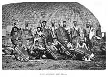 The Zulu army, while a product of a warrior culture, was essentially a militia force which could be called out in time of national danger.[40] It had a very limited logistical capacity and could only stay in the field a few weeks before the troops would be obliged to return to their civilian duties.[41] Zulu warriors were armed primarily with assegai thrusting spears, known in Zulu as iklwa, knobkierrie clubs, some throwing spears and shields made of cowhide.[42] The Zulu warrior, his regiment and the army drilled in the personal and tactical use and coordination of this weapons system. Some Zulus also had old muskets and antiquated rifles stockpiled, a relatively few[14] of which were carried by Zulu impi. However, their marksmanship was very poor, quality and supply of powder and shot dreadful, maintenance non-existent and attitude towards firearms summed up in the observation that: "The generality of Zulu warriors, however, would not have firearms – the arms of a coward, as they said, for they enable the poltroon to kill the brave without awaiting his attack."[43] The British had timed the invasion to coincide with the harvest, intending to catch the Zulu warrior-farmers dispersed. Fortunately for Cetshwayo, the Zulu army had already begun to assemble at Ulundi, as it did every year for the First Fruits ceremony when all warriors were duty-bound to report to their regimental barracks near Ulundi.[44][45]