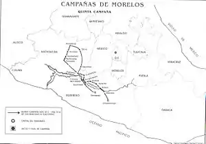 ![]() A map of the fifth and final campaign of José María Morelos, wherein the Battle of Lomas de Santa María took place. | |||||||
