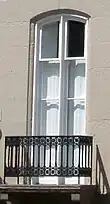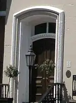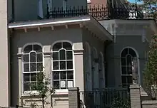 The Bayne–Fowle House is a three-story masonry town house in the Italianate design, located in a finely preserved block of the Old Town of Alexandria. It is surrounded by houses which date to the late 18th century. The house is made of brick with a painted ashlar sandstone facade, with elongated windows, a low-pitched gable roof, and an ornamental cornice. A side conservatory and small garden are found on the eastern side (the right hand side, as seen from the street).[3] Separating the double parlors is a pendant arcade adorned with cast-iron bosses.