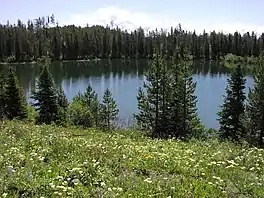Bearpaw Lake is located in Grand Teton National Park, in the U. S. state of Wyoming.[2] Bearpaw Lake is south of Trapper Lake and north of Leigh Lake. Bearpaw Lake is an easy to moderate 9.2-mile (14.8 km) (to Trapper Lake, which is somewhat further) round trip hike along the Leigh Lake Trail.[3][4] The trail starts at the String Lake trailhead and wanders north along the east shores of Leigh Lake with a 460 feet (140 m) elevation gain.[3] Bearpaw Lake is nestled at the eastern base of Mount Moran and snow and glacier meltwaters off Skillet Glacier eventually feed into the lake. There are three backcountry camping sites with designated tent pads at the lake and a backcountry permit is required to use these sites.[5]