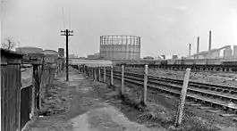 Beckton was the only station on the Beckton branch of the railway, which left the EC&TJR at Custom House, heading initially east by north-east before levelling out to due east once it crossed what is today the Woolwich Manor Way. The station shut to passengers in 1940 after bombing in the Blitz cut it off from the rest of the network. Passenger services were not resumed when the line reopened as by now the works was better served by bus services using the Barking by-pass. The branch survived as a freight line, with the last trainload of pitch from the works leaving in December 1970.[2]