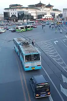 Since 2013, the city has converting bus routes with diesel-engine buses to trolleybus routes by installing overhead power lines along thoroughfares in parts of the city to reduce air pollution.[6] At the time the trolley bus system consists of 15 lines and was operated with a fleet of 588 trolleybuses. 500 new trolleybuses were ordered in anticipation for the expansion.[34] In December 2013, Bus 104快 was converted into trolleybus 127, which became the first new trolleybus route since the creation of No. 124 in 2001.[35] On December 28, 2014, bus fare on all routes was changed to a distance-based fare schedule, which raised the starting fare to ¥2.00 per trip for the first 10 km with ¥1.00 added for each subsequent 5 km. The Yikatong discount was reduced from 60% to 50%.