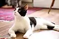 Van-patterned cats are bicolor cats,[1][3] that are mostly white (generally more than 75% white), with color around the ears, separated by a white blaze, and on the tail.[1] They may have small (roughly coin sized) colored spots on and around their spine. The presence of multiple, conjoined, or larger spots on the body and/or an extended head spot that reaches the face indicates the harlequin pattern. The term Van pattern comes from the Turkish Van (named after Lake Van), which is a Van-patterned bicolor breed. The Van pattern is known to animal geneticists as the Seychelles (Seychellois) pattern and is classified into three variants:[4]